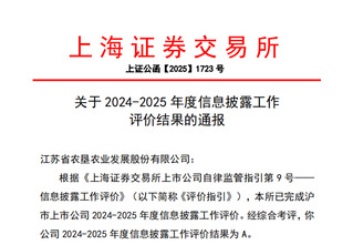 苏垦农发连续六年荣获上交所上市公司信息披露工作最高“A”级评价