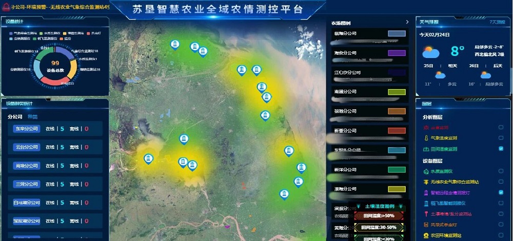 围绕保障粮食安全核心功能,由公司党委抓总、总部科技信息部负责总体架构,集成应用低空农业、无人化装备、人工智能技术,搭建智慧农业“一张图”“一片云”“一张网”共性平台,开发应用无人值守巡田系统、全域“四情”监测系统、智慧灌溉系统,推广精准变量施肥、卫星平整地、北斗辅助驾驶技术装备,多维度提升农业生产效率与管理水平,输出江苏农垦智慧农业集成解决方案。